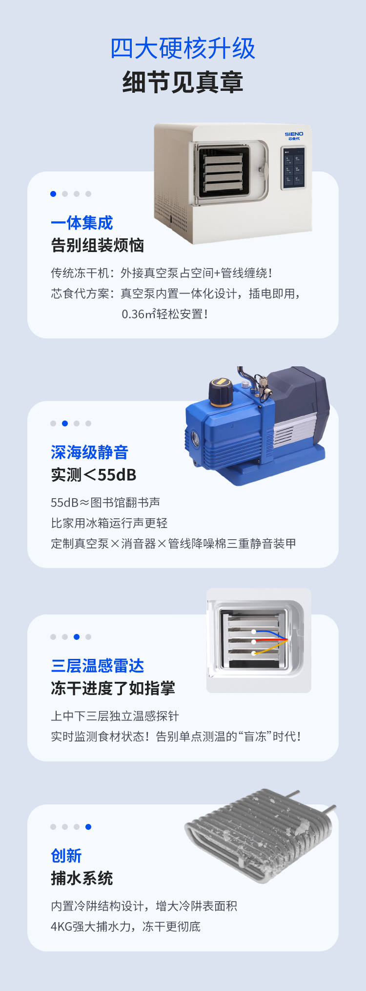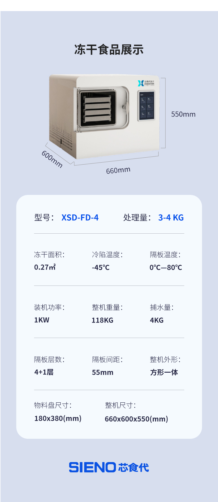 型号 XSD-FD-4 处理器 3-4千克 冻干面积 0.27米 冷阱温度 -45℃ 分区温度 0℃—80℃ 安装功率 1千瓦 整机重量 118千克 捕水量 4千克 分区层数 4+1层 分区间距 55毫米 整体外观 方形一体化 物料托盘尺寸 180×380(毫米) 整体尺寸 660×600×550(毫米)